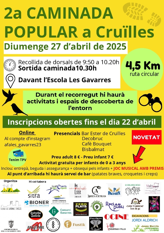 La sortida serà a les 10.30 hores a davant de l’Escola Les Gavarres de Cruïlles. Les inscripcions són obertes fins el dimarts 22 d’abril, tots dos inclosos i es poden fer en línia a través del compte d’instagram @afales_gavarres23, o presencialment: omplint un formulari que es pot trobar al Bar Ester de Cruïlles o, a la Bisbal, al Decobruc, Cafeteria Bouquet o, a Corçà a Bisbalmat.