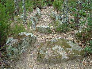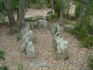 Variants: Si encara tenim temps i ganes de veure un altre (possible) monument megalític, a poca distància del cementiri de Romanyà seguint el GR-92 en direcció al Puig d’Arques val la pena visitar l’anomenat Abric d’en Cama (coordenades UTM 31T 499015, 4634114 ETRS 89). No se’n tenen referències escrites però presenta unes característiques molt similars a les de bona part dels abrics sepulcrals o paradòlmens de la zona, que solien tenir murs de pedra seca o bé alguna llosa de pedra que delimitava o tancava l’espai funerari intern i que servien com a sepultures alternatives a les construccions megalítiques. No es tracta d’un abric únic, sinó de dues petites cavitats naturals formades a la part baixa d’un gran bloc de granit que descansa sobre altres blocs més petits, i que podrien haver estat utilitzades com a llocs d’enterrament durant el Neolític, el Calcolític i l’Edat del Bronze.