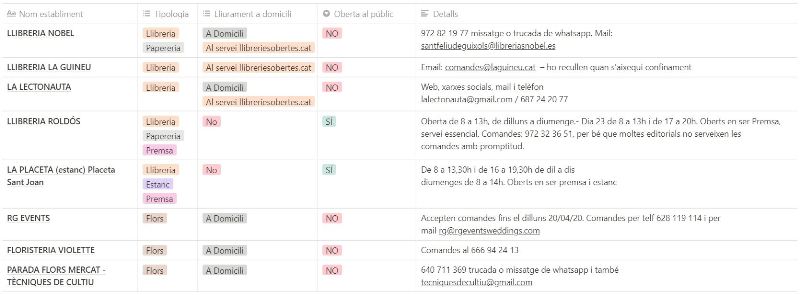 Alguns dels establiments participen a la proposta llibreriesobertes.cat. És un servei sense ànim de lucre impulsat per Òmnium Cultural, la cooperativa cultural Som i l’empresa de recursos digitals Mortensen i que exerceix de plataforma mitjancera entre llibreries locals d’arreu de Catalunya i clients. Permet la compra de llibres en línia, uns llibres que els comerços en qüestió reservaran i entregaran un cop s’hagi superat el confinament domiciliari.