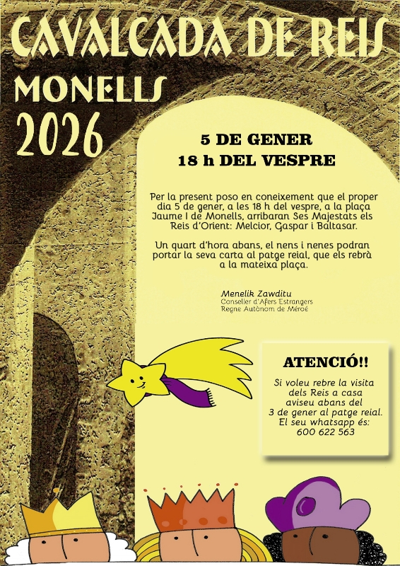 Un any més els tres Reis Mags tornen a passar per Monells i per Cruïlles aquest dilluns 5 de gener. Primerament, passaran a les 18 hores per la plaça Jaume I de Monells, però 15 minuts abans la mainada podrà portar la seva carta al Carter Reial personalment.