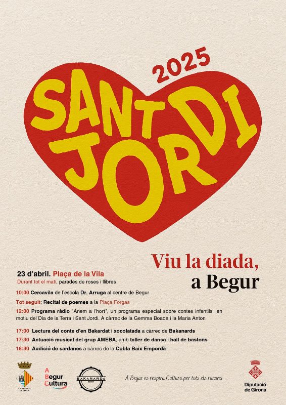 Durant tot el matí hi haurà parades de llibres i roses a la Plaça de la Vila, acompanyades per diverses activitats. A les 10 hores tindrà lloc la cercavila de l’escola Dr. Arruga pel centre de Begur, seguida d’un recital de poemes a la Plaça Forgas. A les 12 hores, Ràdio Begur emetrà el programa especial “Anem a l’hort”, dedicat als contes infantils en motiu del Dia de la Terra i Sant Jordi, a càrrec de Gemma Boada i Maria Anton.