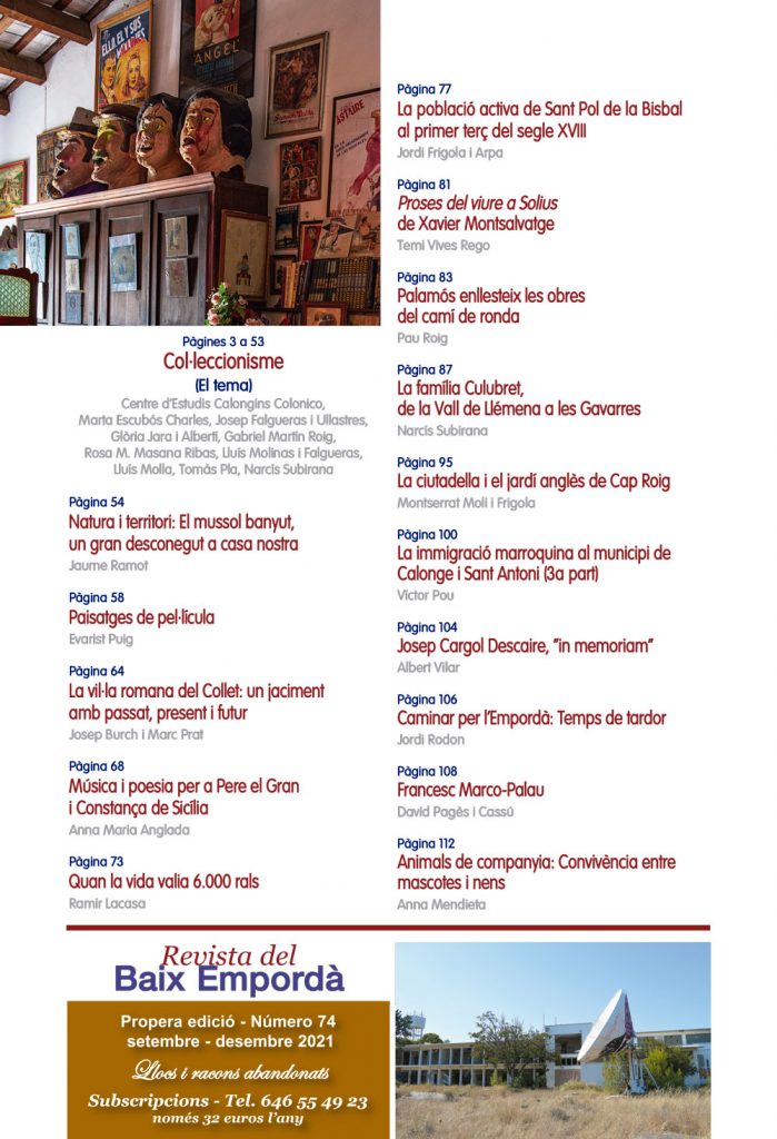 Revista del Baix Empordà dedica el seu tema central no als grans museus de la comarca sinó als petits museus i col·leccions particulars de les temàtiques més diverses del Baix Empordà que, tot i ser poc coneguts, conformen una panoràmica imprescindible sobre la nostra història. Cartells, cotxes i vehicles clàssics, diorames, eines del camp, joguines, maquetes de vaixells, peces arqueològiques, peces de suro, programes de cinema, tallers i obradors artesans… La llista és pràcticament infinita i s’erigeix en una mostra cabdal per entendre la idiosincràsia particular del nostre territori, de les seves tradicions i els seus costums, oferint al mateix temps una successió de petites històries que configuren la gran Història del Baix Empordà. Tot sovint es tracta de peces poc o gens estètiques que mai seran exposades en cap equipament cultural, perdent-se en l’oblit dels seus magatzems, de màquines aparentment insignificants, antiquades o inservibles, però sense les quals el discurs cultural –però també històric– del Baix Empordà restaria incomplet. La publicació, així, vol retre també un homenatge a tots aquells homes i dones que amb tenacitat i rigor, de vegades també amb gran intuïció, han anat guardant en petits locals i magatzems però moltes vegades també a casa seva objectes grans i petits, llibres, papers, records familiars i pintures i dibuixos que si no fos per la seva tasca haurien acabat a les escombraries o venuts a pes en algun mercat de segona mà. Sense la feina invisible però incansable de tota aquesta gent humil, des de pagesos a arqueòlegs aficionats, de mecànics a activistes culturals preocupats per preservar la història dels seus pobles i els seus habitants, la cultura del Baix Empordà no seria la mateixa.