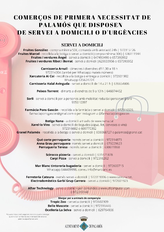 Es tracta d’establiments de primera necessitat que s’ofereixen als ciutadans per tal de facilitar-los l’adquisició d’aliments o serveis, sense haver de sortir de casa seva, poden fer la comanda per telèfon, correu electrònic o whatsapp, i garantint el transport d’aquests productes fins al domicili.