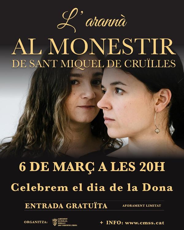 El monestir de Sant Miquel de Cruïlles acollirà el proper 6 de març, a les 20 hores, l’espectacle “Turmarí”, a càrrec del duet L’arannà, en el marc de la commemoració del Dia Internacional de la Dona. L’entrada és gratuïta i l’aforament, limitat.