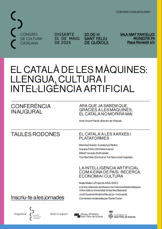 La jornada començarà amb “Ara que ja sabem que, gràcies a les màquines, el català no morirà mai”, conferència inaugural a càrrec de Vicent Partal, director de Vilaweb, i seguirà amb “El català a les xarxes i plataformes”, amb la participació de Mariola Dinarés, periodista de Catalunya Ràdio, Mikel Forcada (Softcatalà) i Toni Bertólez (Del buit al Tot-Neurones fregides). A les 12:30 hores serà el torn de “La intel·ligència artificial com a eina de país: recerca, economia i cultura”, amb Maite Melero (Projecte AINA i BSC), Llorenç Valverde (professor de Ciències Matemàtiques i Informàtica – Universitat de les Illes Balears), i Jordi Ascensi (Andorra Recerca + Innovació), amb moderació a càrrec de Xavier Duran.