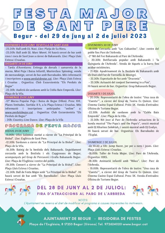 La Festa Major de Sant Pere d’aquest 2023 començarà el dijous 29 de juny amb sardanes i l’ofici solemne cantat a càrrec de La Principal de la Bisbal; el bateig de la bestiola dels Bakanards i una cercavila amb la bestiola i els capgrossos de Begur, acompanyats pel Grup de Percussió i Gralla Bakanards Begur; i un concert i ball de Festa Major a càrrec de La Principal de la Bisbal.
