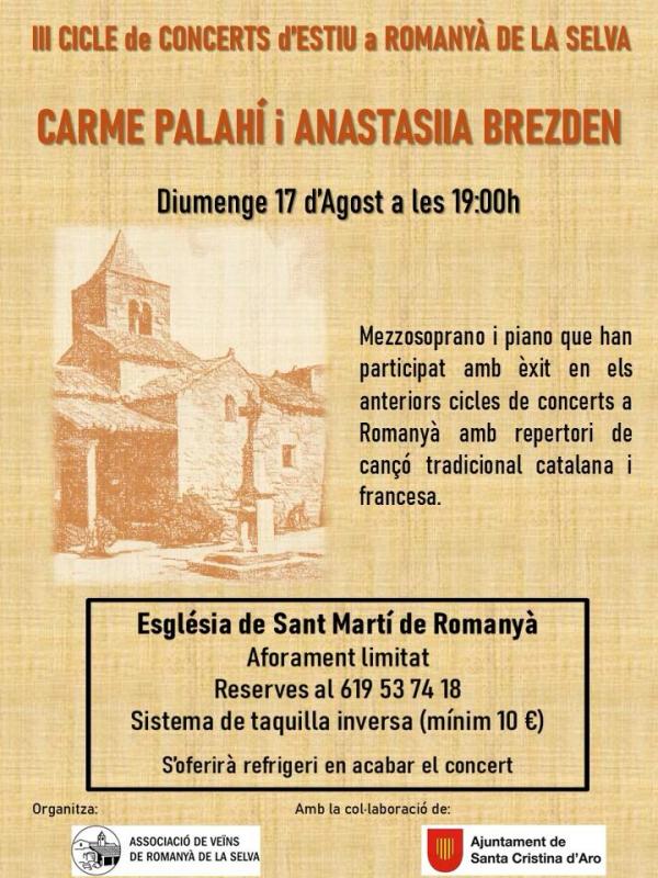 El proper diumenge 17 d’agost a les 7 de la tarda l’Associació de veïns de Romanyà de la Selva organitzarà el darrer concert del cicle en el marc incomparable de l’església de Sant Martí de Romanyà de la Selva. Un any més, per tercer any consecutiu, la mezzo-soprano Carme Palahí i la pianista Anastasiia Brezden culminaran el cicle de Concerts d’estiu. Enguany delectaran al públic amb un repertori de cançó tradicional catalana i francesa.