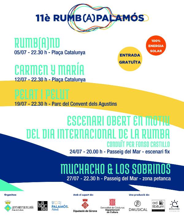 La banda pròpia del festival, Rumba(nd)Palamós, serà l’encarregada d’obrir l’onzena edició el proper divendres 5 de juliol a la plaça Catalunya. El següent divendres, dia 12 de juliol, la formació Carmen y María oferiran el seu concert al mateix espai, i també a les 22.30 hores.
