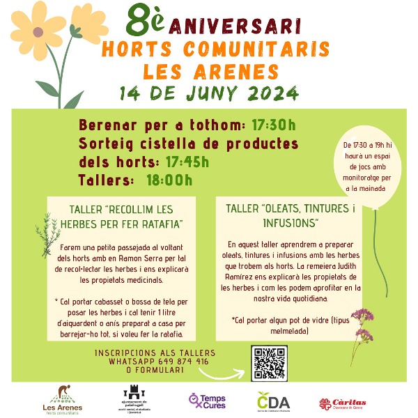 Els horts obriran les seves portes a 2/4 de 6 de la tarda amb un berenar per a tots els assistents. Tot seguit, a les 6, es faran un parell de tallers. El taller “Recollim les herbes per fer ratafia” consistirà en una passejada per recol·lectar les herbes, a càrrec de Ramon Serra, que també n’explicarà les propietats medicinals. I en el taller “Oleats, tintures i infusions”, la remeiera Judith Ramírez explicarà les propietats de les herbes i com aprofitar-les en la vida quotidiana. Per participar als tallers cal inscripció prèvia per whatsapp al 649 874 416 o a través d’un codi QR.