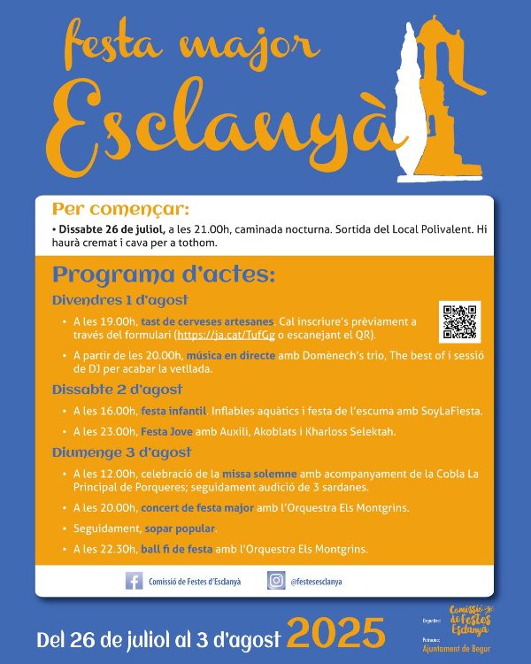 La Festa Major d’Esclanyà 2025 tindrà lloc de l’1 al 3 d’agost, amb un programa d’activitats pensat per a tots els públics. Com a avantsala, el dissabte 26 de juliol, a les 21 hores es va programar una caminada nocturna amb sortida des del Local Polivalent.