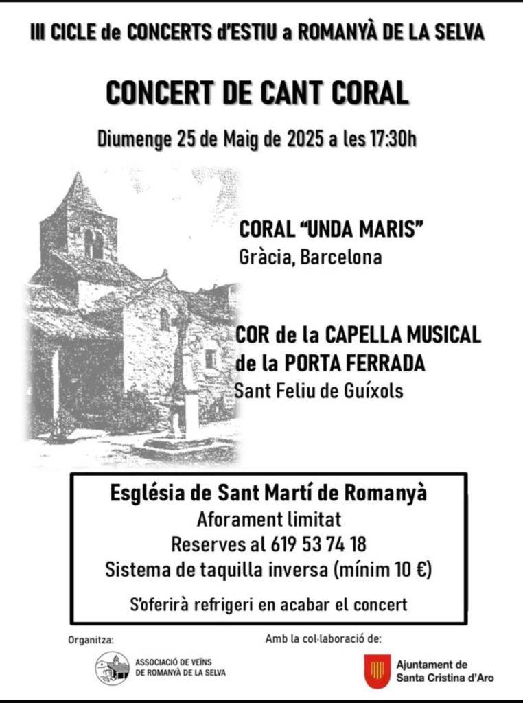 Els concerts organitzats per l’Associació de veïns de Romanyà de la Selva compten amb la col·laboració de l’Ajuntament de Santa Cristina d’Aro. Tots els concerts es realitzaran a l’església de Sant Martí de Romanyà i a la sortida s’oferirà un refrigeri. Prèviament cal reservar l’assistència al telèfon 619 537 418. El preu de l’entrada –a partir de 10 euros– a través de la taquilla inversa.