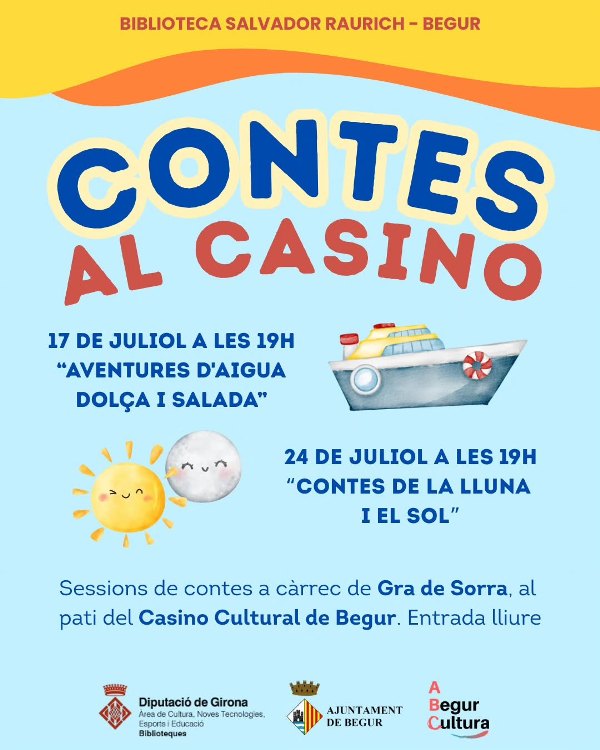 La Biblioteca Salvador Raurich de Begur no s’atura durant l’estiu. Amb l’objectiu de garantir la continuïtat de les activitats habituals, ha programat quatre sessions de contes per als mesos de juliol i agost, que tindran lloc a la terrassa del Casino Cultural.