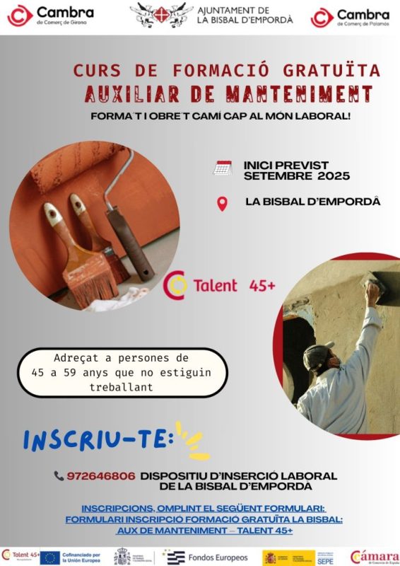 L’Ajuntament de la Bisbal d’Empordà, amb el suport de les Cambres de Comerç de Palamós i Girona, ha posat en marxa dos cursos gratuïts d’Auxiliar de Manteniment, adreçats a col·lectius amb més dificultats d’inserció laboral: d’una banda, joves d’entre 16 i 29 anys inscrits a Garantia Juvenil i, de l’altra, persones de més de 45 anys en situació d’atur.