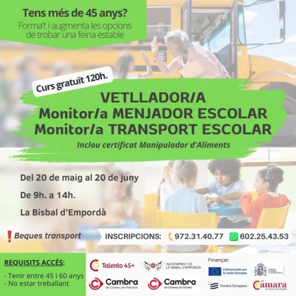Aquest mes de maig, la Bisbal d’Empordà acollirà un curs gratuït de 120 hores adreçat a persones d’entre 45 i 60 anys en situació d’atur, per formar-se com a vetllador/a, monitor/a de menjador escolar i monitor/a de transport escolar.