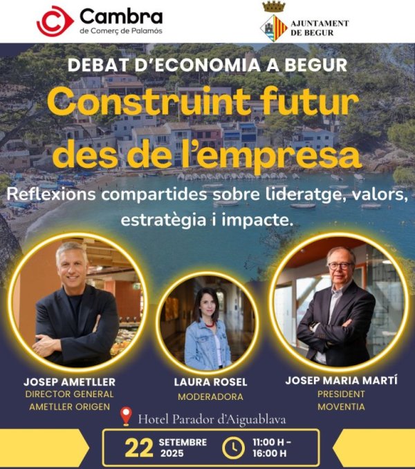 “Construint futur des de l’empresa . Reflexions compartides sobre lideratge, valors, estratègia i impacte” és el títol de la 17è edició del Debat d’Economia a Begur, organitzat per la Cambra de Comerç de Palamós juntament amb l’Ajuntament de Begur, qu e se celebrarà el dilluns 22 de setembre al Parador d’Aiguablava.