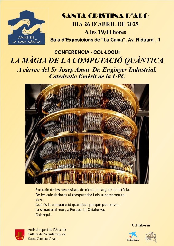La conferència “La màgia de la computació quàntica”, organitzada pels Amics de La Casa Màgica, tindrà lloc el proper dissabte 26 d’abril, a les 7 de la tarda a la sala d’exposicions “la Caixa” de Santa Cristina d’Aro. Es realitzarà amb la col·laboració de l’àrea de Cultura de l’Ajuntament de Santa Cristina d’Aro, CaixaBank, els Serveis Territorials de Girona del departament de Cultura de la Generalitat de Catalunya i La Casa Màgica –col·lecció Xevi.