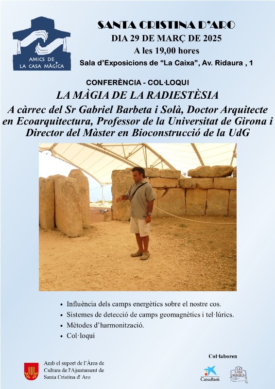 La conferència-col·loqui La màgia de la radiestèsia tindrà lloc a la sala d’exposicions “la Caixa” de Santa Cristina d’Aro a les 7 de la tarda. Es realitzarà amb la col·laboració de l’àrea de Cultura de l’Ajuntament de Santa Cristina d’Aro, CaixaBank, els Serveis Territorials de Girona del departament de Cultura de la Generalitat de Catalunya i La Casa Màgica –col·lecció Xevi.