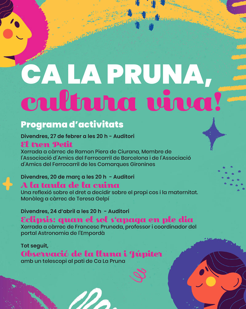 El cicle porta el nom de “Ca la Pruna, cultura viva” i l’objectiu és oferir a la ciutadania una programació pensada per a totes les edats i gustos. Les activitats seran gratuïtes i tindran lloc a l’Auditori de Ca la Pruna.