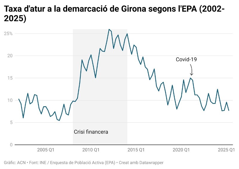 Si es tira enrere en l’històric, aquest és el millor segon trimestre que s’ha registrat a les comarques gironines d’ençà del 2007, quan la taxa d’atur va situar-se al 6,98%. Des d’aleshores, entre maig i juny aquest percentatge sempre ha estat més alt del 7,71% que s’ha assolit aquest 2025.