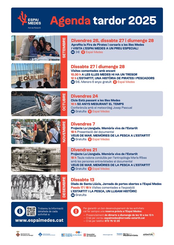 La programació d’aquest quadrimestre, de setembre a desembre, començarà amb les visites comentades en el marc de la Fira de Pirates i Corsaris de l’Estartit i seguirà amb diversos actes vinculats als principals projectes que impulsa l’Espai Medes. Aquesta nova etapa de programació estable vol oferir propostes participatives al llarg de tot l’any, pensades per al públic local, visitants i comunitat educativa.