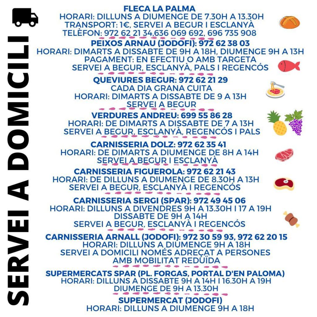 Amb l’objectiu de facilitar una font de consulta fiable i fer difusió dels comerços que ofereixen béns de primera necessitat, l’Ajuntament de Begur comparteix dos llistats amb els horaris dels establiments i farmàcies begurenques que fan servei a domicili durant el període de confinament, evitant així desplaçaments innecessaris dels veïns i veïnes i reduint la possible propagació del coronavirus.