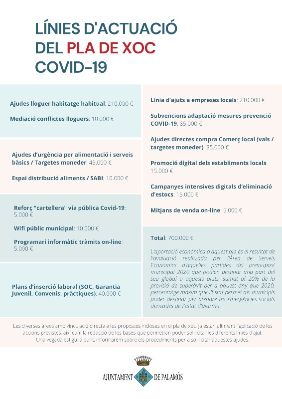 L’aportació econòmica d’aquest pla és de 700.000 euros, resultant de l’avaluació realitzada per l’Àrea de Serveis Econòmics d’aquelles partides del pressupost municipal 2020 que podien destinar una part del seu global a aquests ajuts; sumat al 20% de la previsió de superàvit per a aquest any que 2020, percentatge màxim que l’Estat permet als municipis poder destinar per atendre les emergències socials derivades de l’estat d’alarma.
