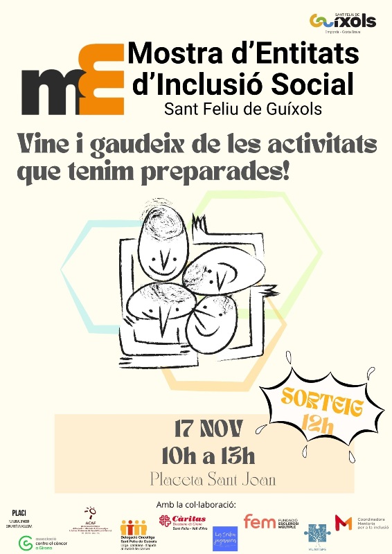 La Mostra d’Entitats d’Inclusió Social per al Foment del Voluntariat, impulsada per la Taula d’Entitats d’Inclusió Social i Cooperació de Sant Feliu de Guíxols tindrà lloc el diumenge 17 de novembre de 10 a 13 hores a la Placeta Sant Joan.