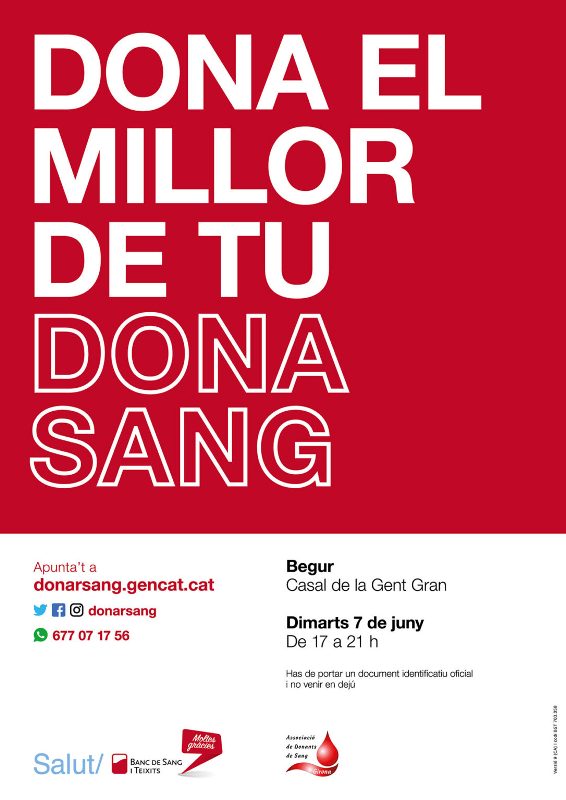 Begur.- L’Ajuntament de Begur i el Banc de Sang i Teixits organitzen una nova jornada de donació de sang el pròxim dimarts 7 de juny. La donació tindrà lloc de 17 a 21 hores al Casal de la Gent Gran.