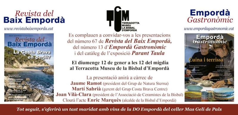 L’acte, que inclourà la presentació dels últims números de la Revista del Baix Empordà, “La Costa Brava en perill?”, i Empordà Gastronòmic, que inclou el dossier “Cuina i terrissa”, anirà a càrrec de Jaume Ramot (president del Grup de Natura Sterna), Martí Sabrià (gerent de la Unió d’Empresaris d’Hostaleria i Turisme Costa Brava Centre) i Joan Vilà-Clara (president de l’Associació de Ceramistes de la Bisbal), i comptarà també amb la intervenció de l’alcalde de la Bisbal d’Empordà, Enric Marquès,. Tot seguit s’oferirà un tast al assistents maridat amb vins de la DO Empordà del celler Mas Geli de Pals.