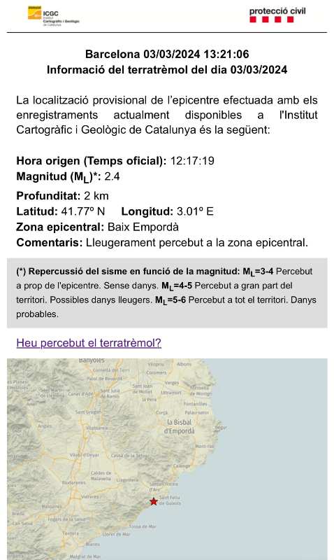 Sant Feliu de Guíxols (ACN).- Un petit terratrèmol de magnitud 2,4 a l’escala de Richter s’ha registrat aquest diumenge al migdia al Baix Empordà i sense provocar danys, segons l’Institut Cartogràfic i Geològic de Catalunya (ICGC).