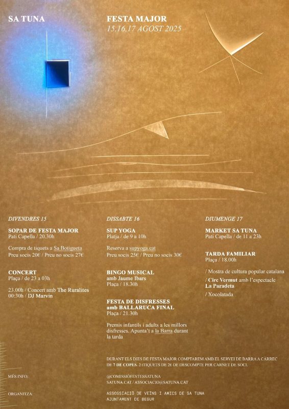 Organitzada per l’Associació de Veïns i Amics de Sa Tuna amb la col·laboració de l’Ajuntament de Begur, la Festa Major convida veïns, veïnes i visitants a gaudir d’un cap de setmana ple de diversió i bon ambient.