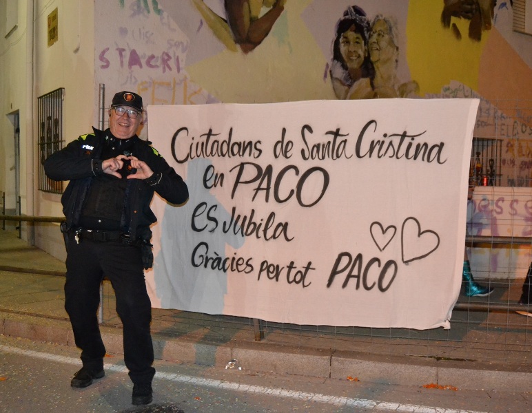 A més dels premis, l’Associació de Colles de Carnaval de Santa Cristina d’Aro ha agraït el treball i la bona entesa que sempre ha tingut l’agent Paco Escámez, amb totes les colles de Carnaval, amb una pancarta just a on començava la rua i seguidament, al pavelló, se li ha lliurat una placa en motiu de la seva jubilació.