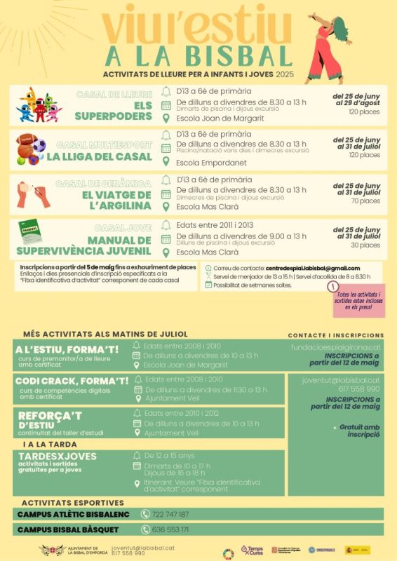 A nivell esportiu, el Campus Atlètic Bisbalenc (inscripcions al 722 747 187) o el Campus Bisbal Bàsquet (inscripcions al 636 553 171), també oferiran activitats per aquest estiu. Es pot consultar més informació al correu electrònic joventut@labisbal.cat o al telèfon 617 558 990.